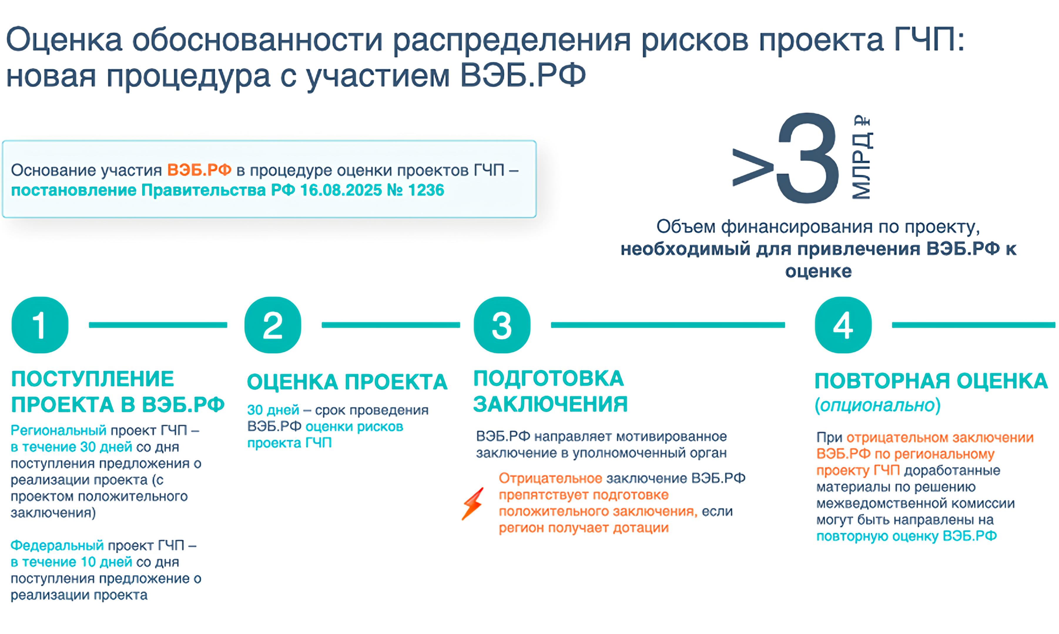 ВЭБ.РФ на основании постановления Правительства Российской Федерации от 16 августа 2025 г. № 1236 «О внесении изменений в некоторые акты Правительства Российской Федерации» (принято во исполнение поручения Президента Российской Федерации по итогам пленарного заседания IX Восточного экономического форума) осуществляет оценку обоснованности распределения рисков проектов ГЧП в рамках осуществления экспертно-аналитической деятельности в соответствии с пунктом 15 части 4 статьи 3 Федерального закона от 17 мая 2007 г. № 82-ФЗ «О государственной корпорации развития «ВЭБ.РФ».